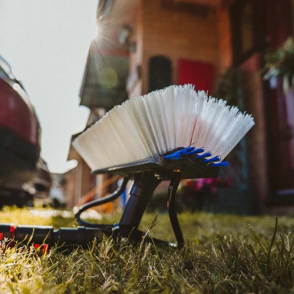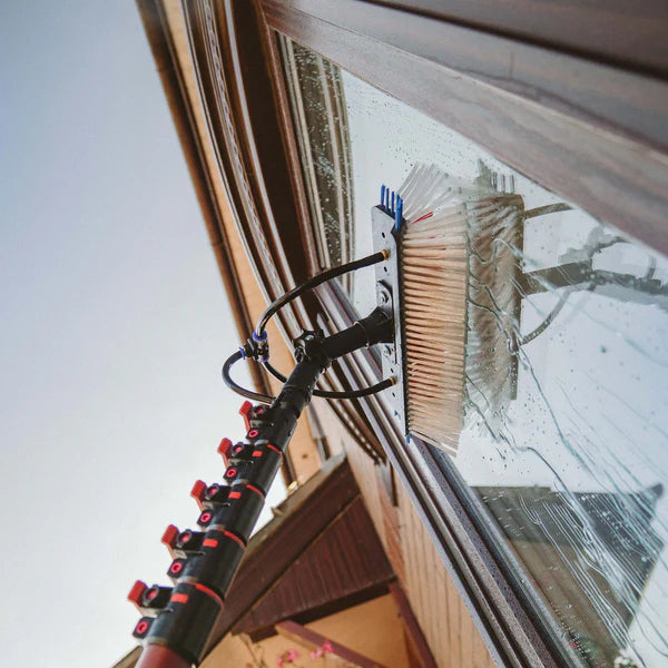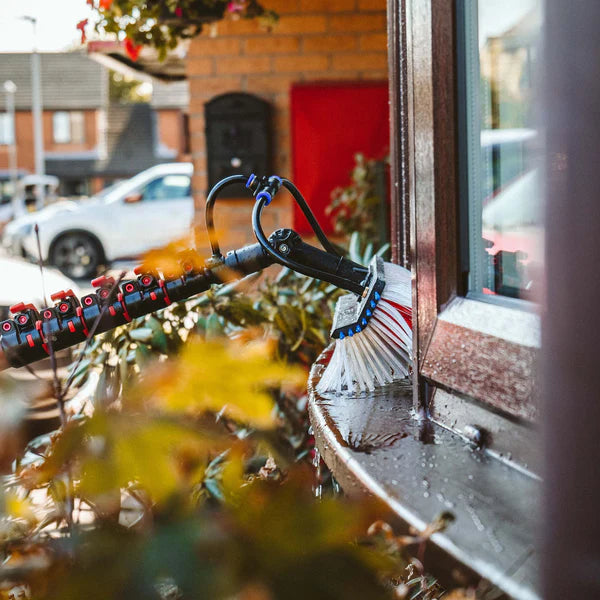 This charcoal grey brush head features high-quality DuPont® Nylon bristles and an angled stock, designed to clean windows and sills simultaneously. Stiff red inner and end bristles provide powerful scrubbing while protecting the stock from contact with window frames and brickwork. Perfect for professional exterior cleaning with great coverage and durability.
